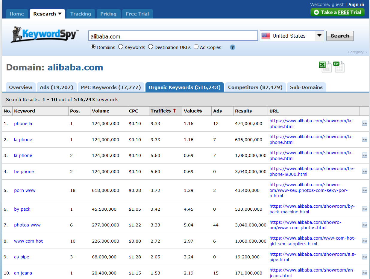 这里我们可以查询对手网站的竞价文案,直接输入竞争对手的网址,下面的选项选择domain,选择目标国家,点击搜索。以alibaba.com为例,如下图: