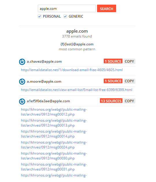 输入苹果公司的网站域名,会出来大量的邮件以及网站来源。通过maildb,可以快速的找到他人的邮箱,只要知道姓名和邮箱后缀即可。当然结果那么多,有效采购负责人就需要你自己去筛选了。