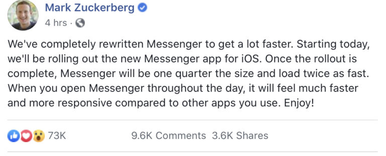 关于Facebook的最新资讯:Facebook将会对Messenger进行架构优化,压缩应用程序大小,相比之前,其访问速度会提高到原来的两倍,因为更新,Messenger中的某些功能将暂时不可用,有些选项卡也会被移除,但通过搜索还是可以找到。 Facebook首席执行官马克·扎克伯格(Mark Zuckerberg)也在社交平台上表示,与其他用户使用的应用程序相比,其速度和响应能力将明显提升!