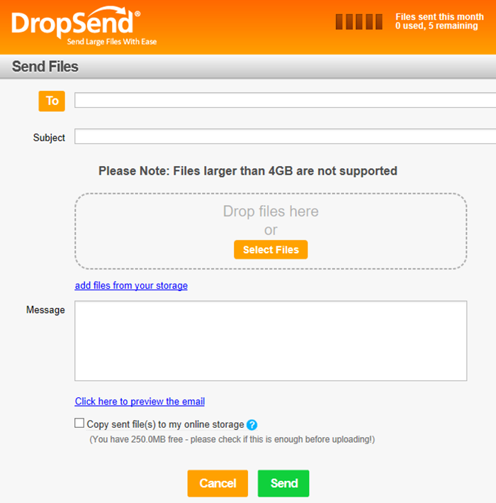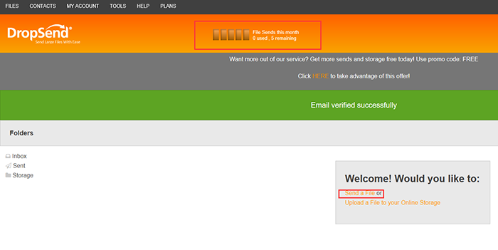2、登陆后进入这个页面就可以选择发送文件啦,每个注册用户每个月都有五次免费发送大文件的机会,上方的五个小方块就是用来记录每月免费次数。