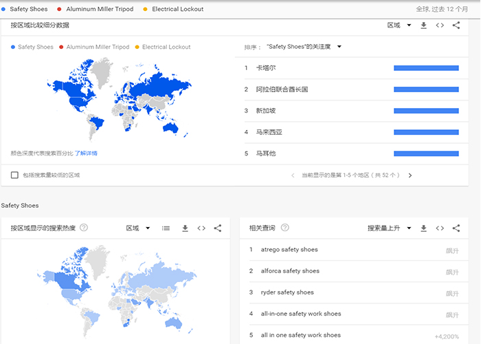一般而言,产品市场最大的会比较容易销售,根据下图Google trends的显示,可以看到三种产品的热度,从市场容量的角度看,做【Safety Shoes】最划算。