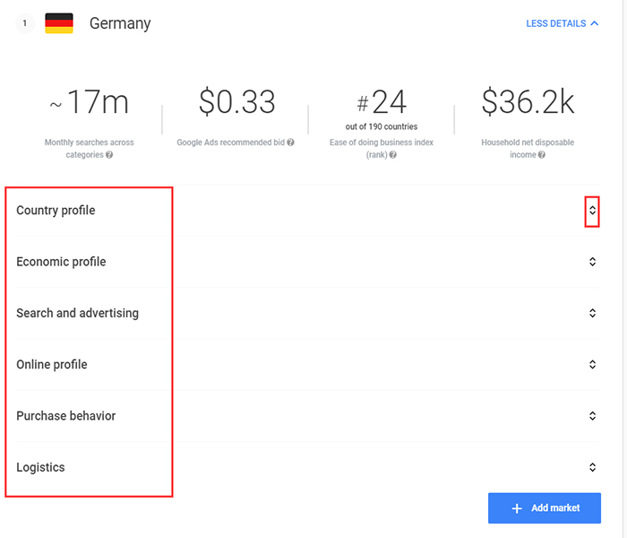 另外点开【MORE DETAILS】还可以看到每个国家的GDP,人口特征:包括收入水平、平均年龄等,甚至网络消费行为这些信息,这些数据都有助于我们分析、了解某一个市场区域。