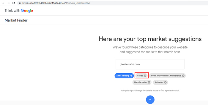 我们来实测一下是否准确。比如我输入了阀门产品的网址tjtwatervalve.com,就会出来属于“Valves”(阀门)这个品类。