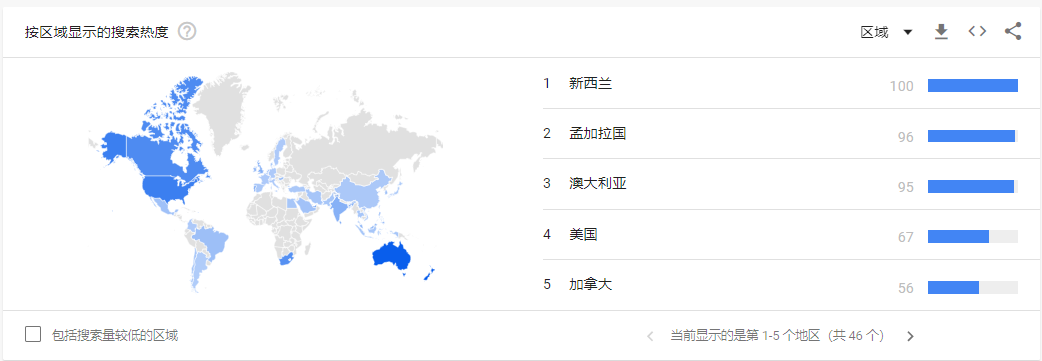 同时可以看到按照区域显示的搜索热度,43个国家和地区中新西兰、孟加拉国、澳大利亚、美国和加拿大等国家是搜索热度最高的国家,这也是产品进行营销推广需要重点考量的市场。