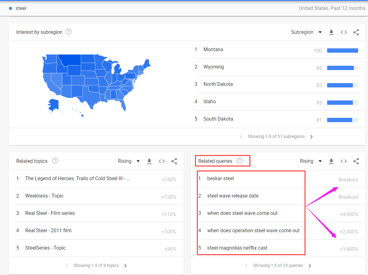谷歌趋势显示您这些关键词的流行顺序,甚至会为您提供每一个词精确的百分比搜索量增加比例。有时,它可能会将%搜索量替换为单词“Breakout”。这意味着关键字增加了超过5000%。