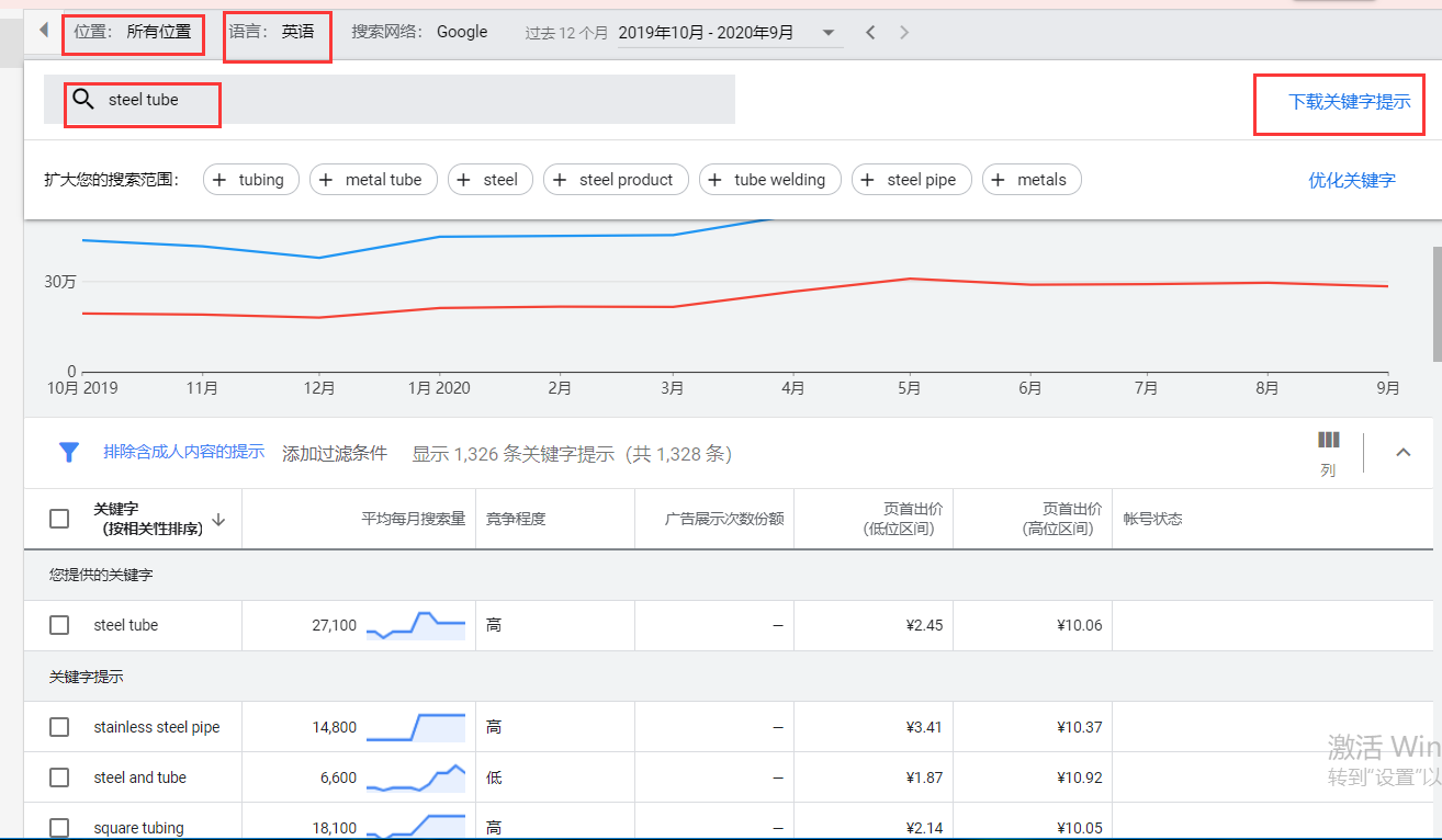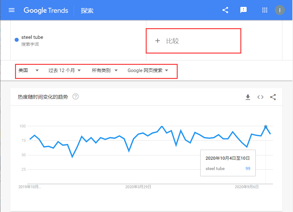 同样以steel tube为例,我们可以在关键词的下方选择地区、时间等。也可以加入一些其他的关键词来比较。