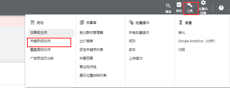 2、进入谷歌Ads账号,选择页面右上方工具这里,从下拉页面里选择关键字规划师。