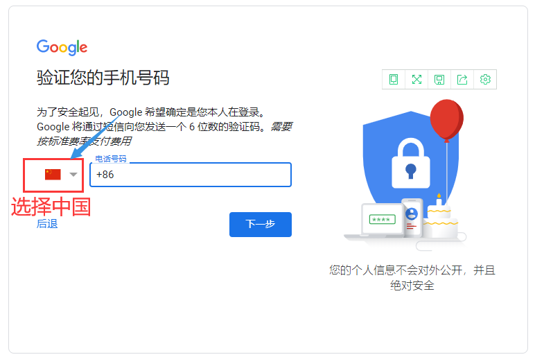 接下来我们进入手机验证的环节,选择中国,输入手机号,但是提示该电话号码不能用于验证,应该怎么办呢?