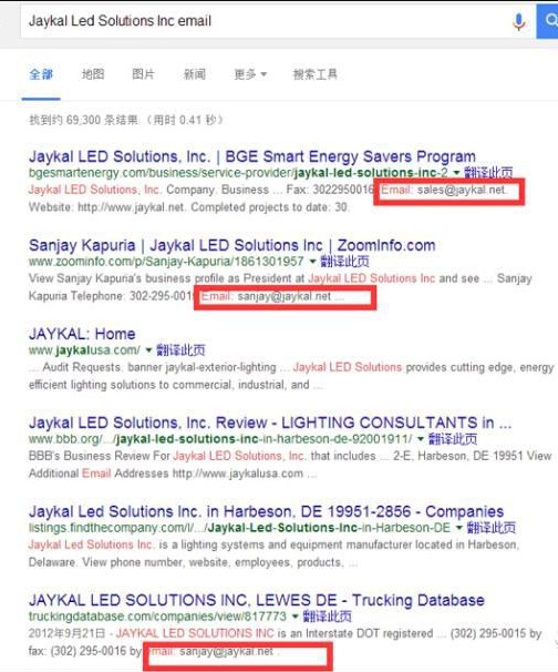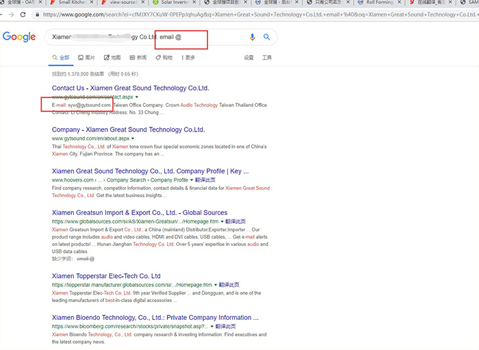 “公司名称+Email+@”,这样搜索会更加精准,因为有些网页虽然有公司名称,并没有有Email字样,但是客户可能留了Email。