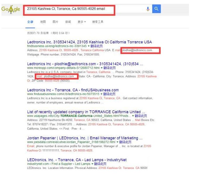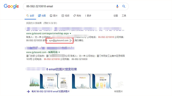 当然,也不排除有些客户为了省事,地址简写了。如果我们知道联系电话,可以用“公司电话+email”进行搜索,真是个机灵鬼儿~