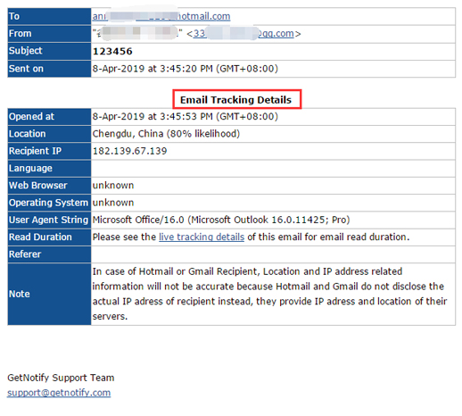 比如收件人邮箱是8888@qq.com,则发送邮件时收件邮箱为8888@qq.com.getnotify.com,以下是追踪详情,可以追踪到收件人具体何时打开并阅读了你的邮件、收件人地区及IP地址。