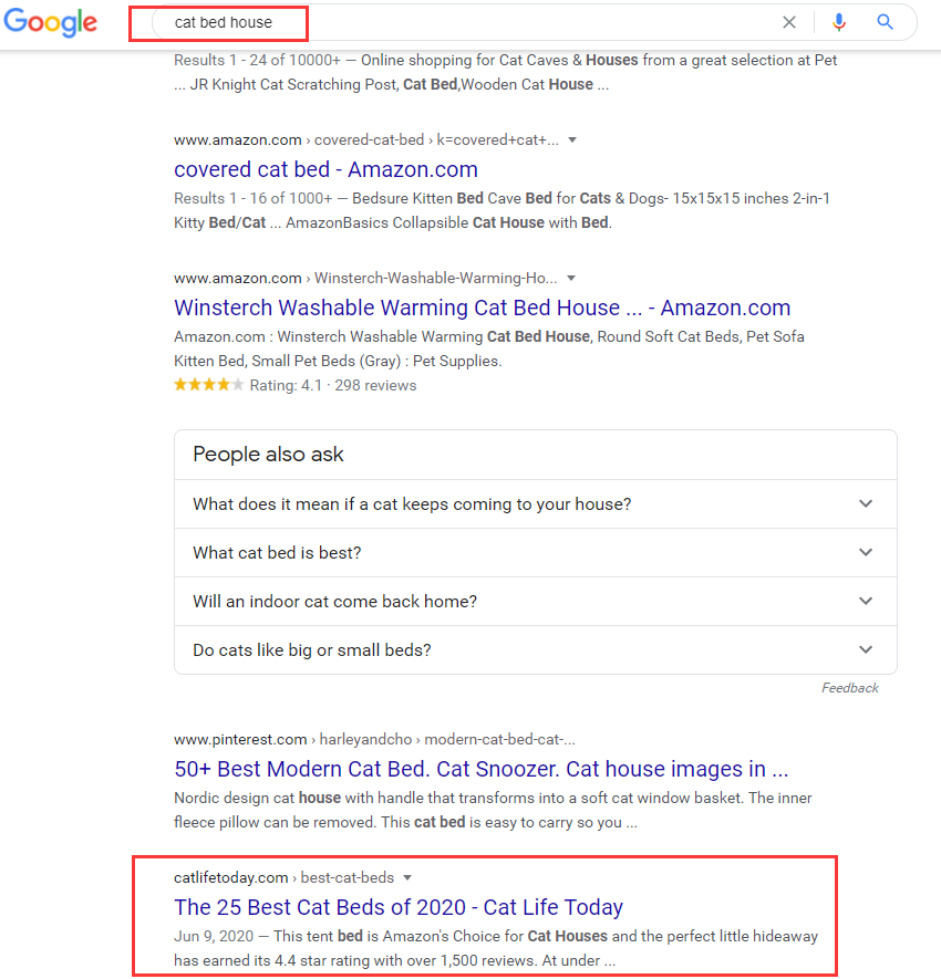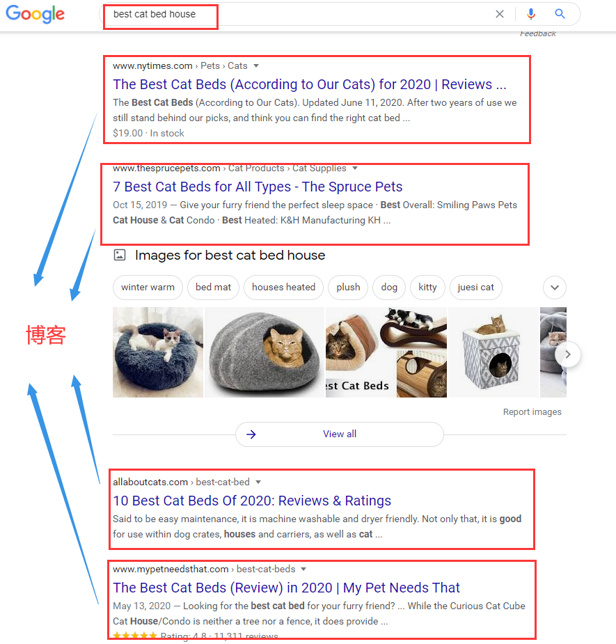 谷歌为了丰富搜索结果页面,在用户搜索产品关键词的时候,也会插入一个文章的网页。例如,当用户搜索“cat bed house”的时候可以发现绝大部分的排名网页都是电商网站,但是首页有一个网页“The 25 Best Cat Beds of 2020”,这就是博客文章。(下图红框)
