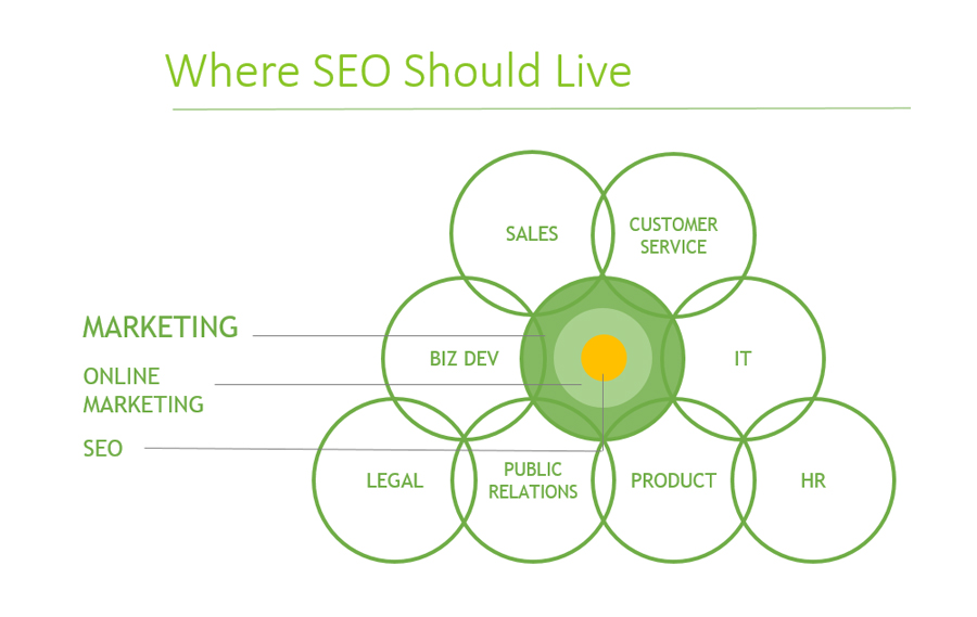 不幸的是,在大多数企业中,搜索数据只被搜索和数字团队使用,甚至大多数SEO团队和他们的数据只是传统地存在于市场营销范畴内的网络营销中,结构图如下: