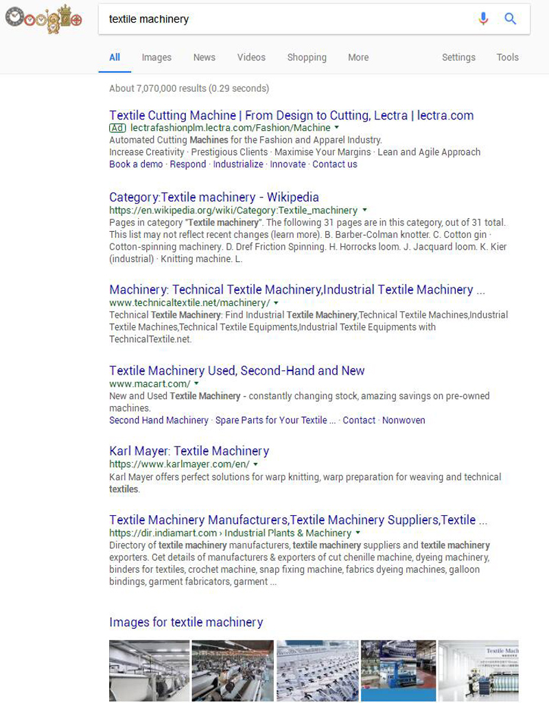 我们以纺织机械“textile machinery”为例,在下图中,你可以看到有投放了谷歌付费广告的网站,也有自然排名优化靠前的网站,在下面还有一些纺织机械的产品图,非常直观。