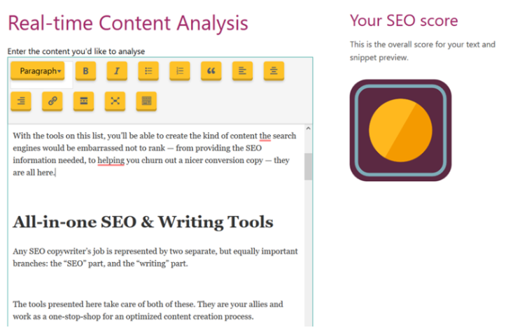 Yoast是目前世界上最大的WordPress SEO插件。他们的SEO内容创建工具结合了许多SEO建议和编写处理器功能。就像上述SEMrush的Writing Assistant一样,它是一种云服务,因此你可以随时开始写作。不一样的地方在于,Yoast会为你免费提供SEO建议。