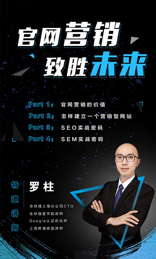 罗柱老师从官网营销的价值、营销型网站的标准、SEO实战密码和SEM实战密码四个方面,透彻地剖析了全球搜的优势。
