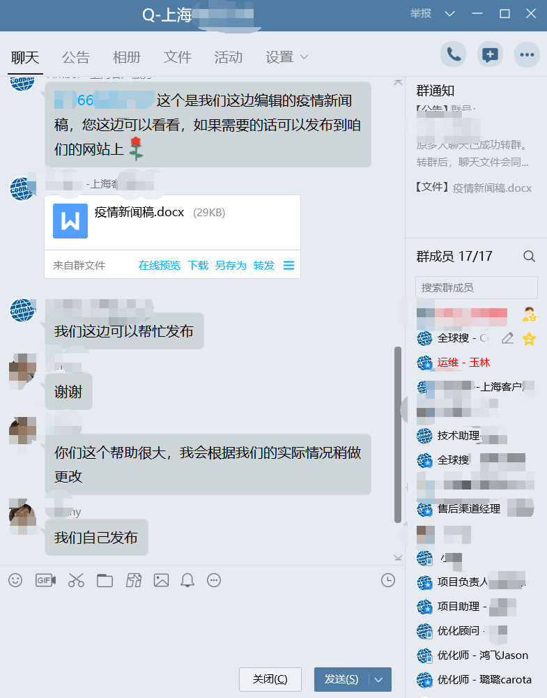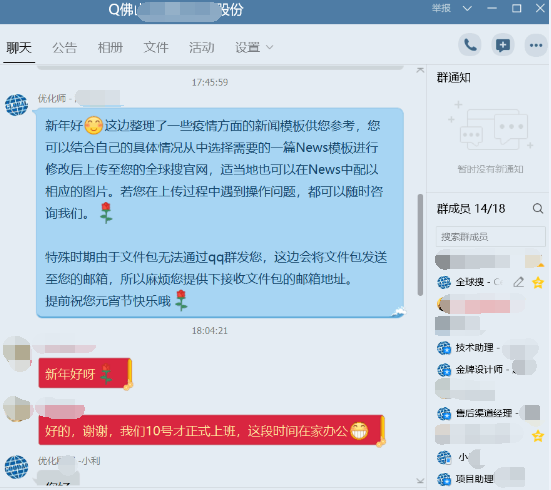 所有的外贸人一起努力,让国外的客户放心采购,了解目前的真实疫情,全球搜人为中国的外贸企业提供新闻宣传样稿,大家根据自己企业的真实情况来展现。
