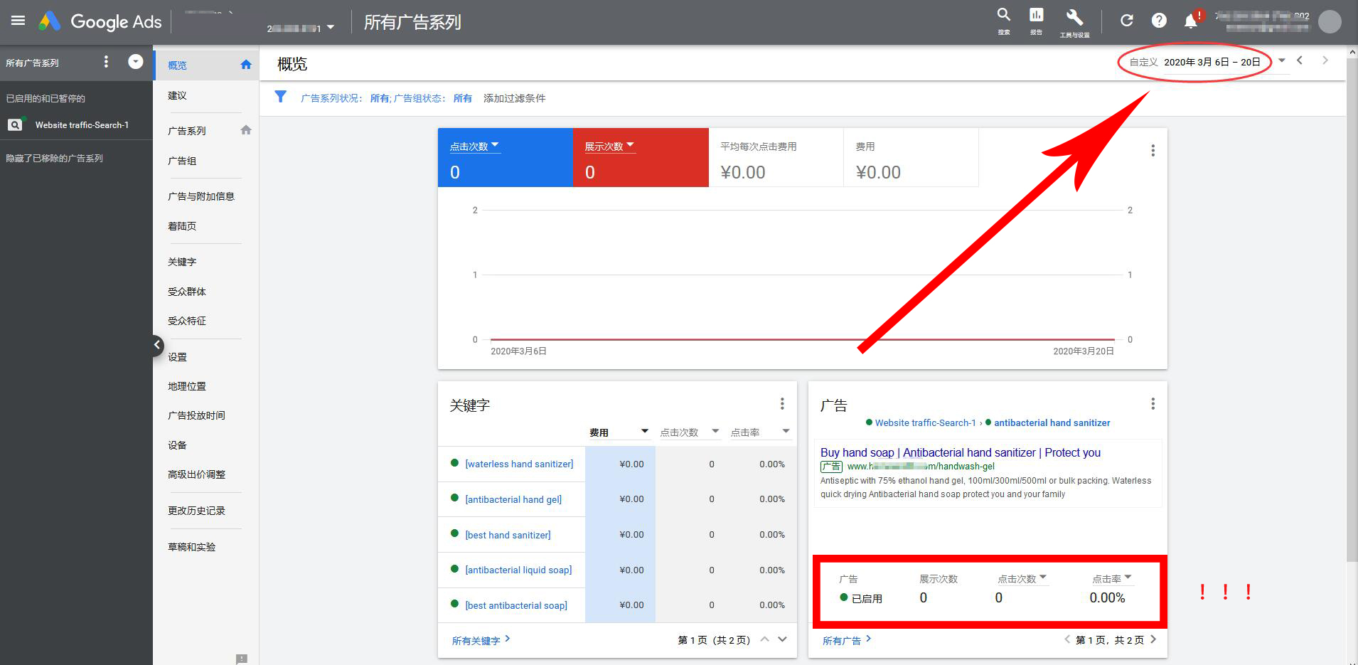下图为小编亲测:【抗冠状病毒洗手液】广告的投放!上架两周,广告状态已通过审核!但0展示!0点击!