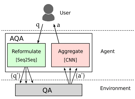 我们把这一代理称之为AQA,它是一个积极回答问题的策略。AQA旨在通过向知识库发送重塑过的问题以最大化获取正确答案的几率。