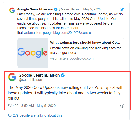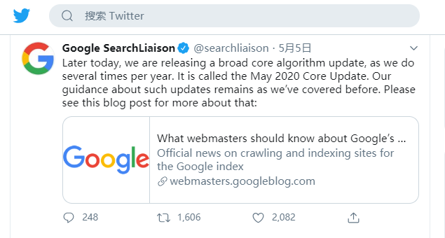 谷歌的官方发言人,丹尼·沙利文(Danny Sullivan)5月4日在Twitter上明确表示:谷歌在5月4日正式启动了这次的算法更新。并命名为:2020年5月核心更新。