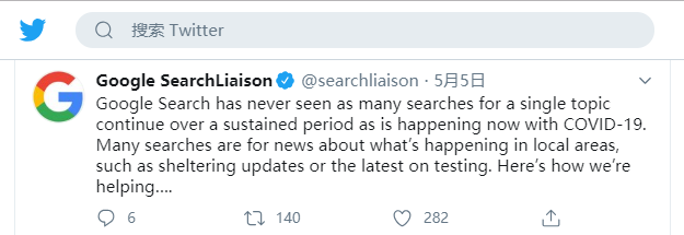 谷歌也表示:谷歌搜索从未见过像COVID-19这样,对单个主题的搜索持续时间如此之长。许多搜索都是有关本地正在发生的新闻,比如最新的消息和最新的测试结果等。也就是说,疫情已经改变了人们的搜索习惯以及需求。
