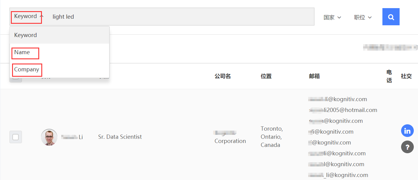 3. AI商机搜索: 通过人名,产品关键词,公司名称就可以查询到这个“采购商”的其他联系方式,以及他所在公司负责采购物品的决策者,在技术层面,就可以轻松实现外贸企业与采购商的无缝对接。